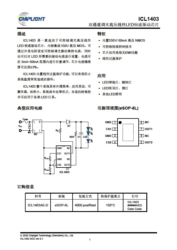 ICL1403 是一款适应于可控硅调光高压线性LED 恒流驱动芯片,内部集成550V高压MOS。可通过外设电阻设定可控硅调光器的维持电流,同时也可以对 LED 所需要的驱动电流进行设置,电流可在 5mA~60mA 范围内进行任意调节,芯片电流精准度可达到+3%。