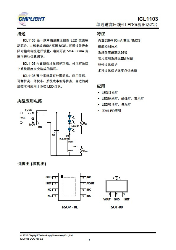 ICL1103 是一款单通道高压线性 LED 恒流驱动芯片,内部集成 500V 高压 MOS。可通过外设电阻对输出电流进行设置,电流可在 5mA~60mA 范围内进行任意调节。