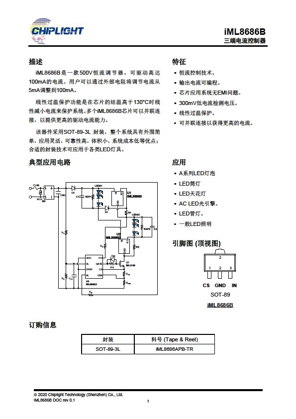 iML8686B是一款500V恒流调节器,可驱动高达100mA的电流。用户可以通过外部电阻将调节电流从5mA调整到100mA。