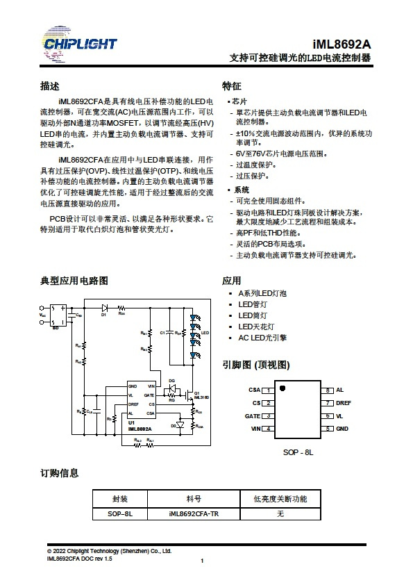 iML8692CFA是具有线电压补偿功能的LED电流控制器,可在宽交流(AC)电压源范围内工作,可以驱动外部N通道功率MOSFET,以调节流经高压(HV)LED串的电流,并内置主动负载电流调节器、支持可控硅调光。