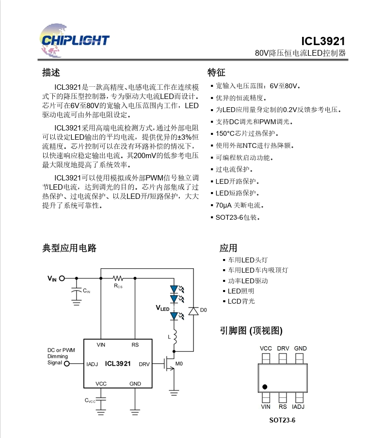 ICL3921是一款高精度、电感电流工作在连续模式下的降压型控制器,专为驱动大电流LED而设计。芯片可在6V至80V的宽输入电压范围内工作,LED驱动电流可由外部电阻设定。