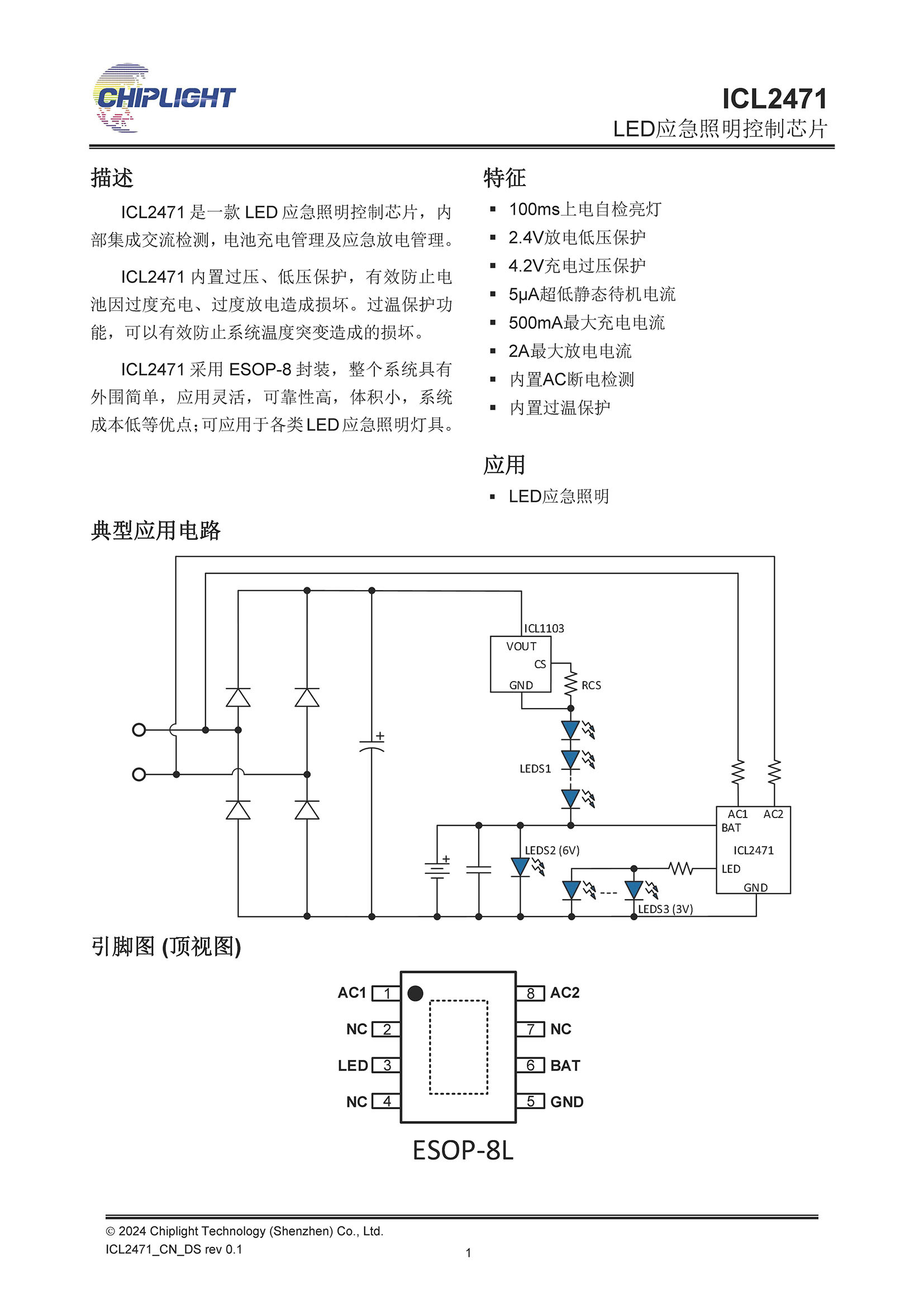 ICL2471是一款LED应急照明控制芯片,内部集成交流检测,电池充电管理及应急放电管理。
