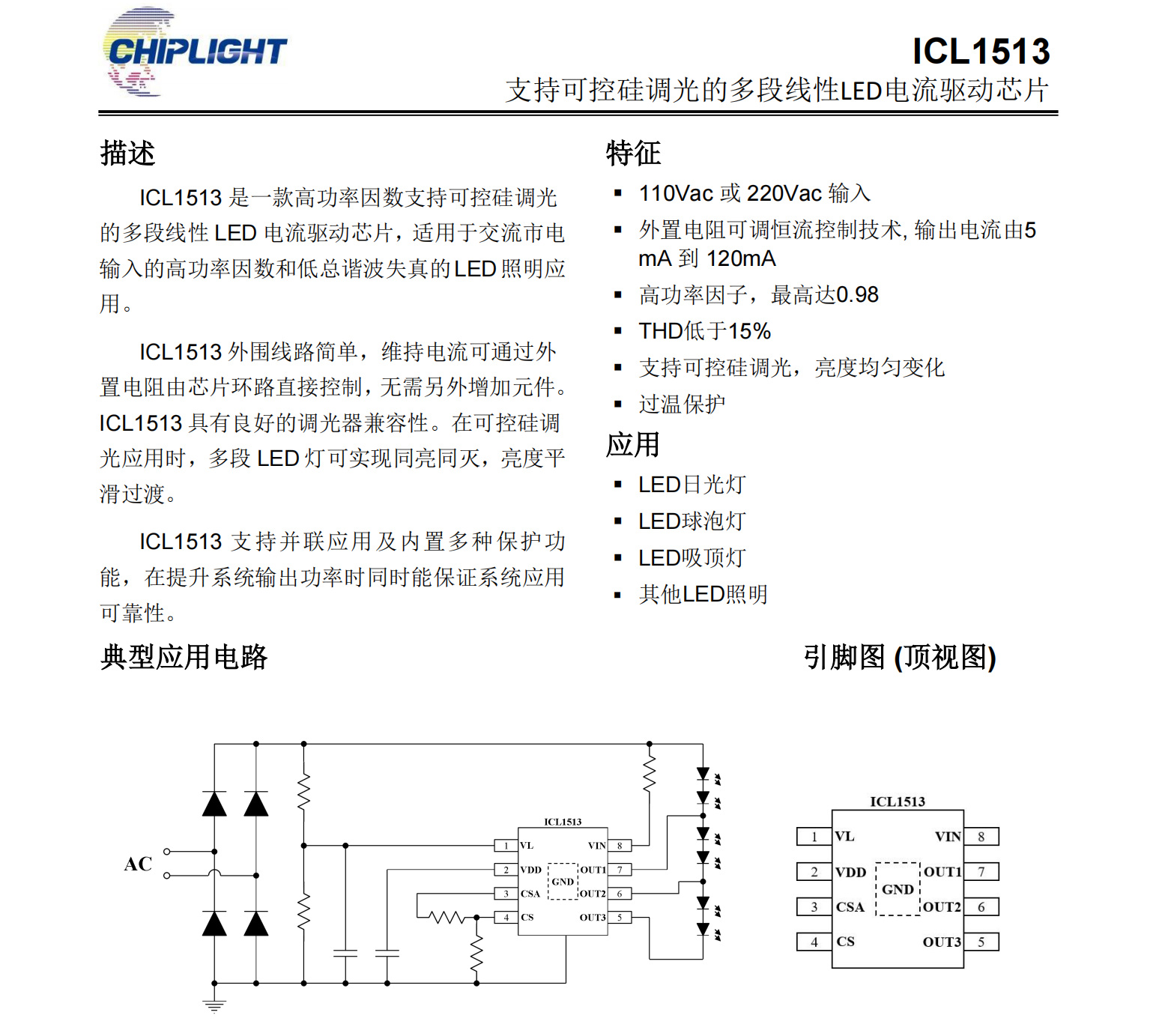 ICL1513 是一款高功率因数支持可控硅调光的多段线性 LED 电流驱动芯片,适用于交流市电输入的高功率因数和低总谐波失真的LED照明应用。