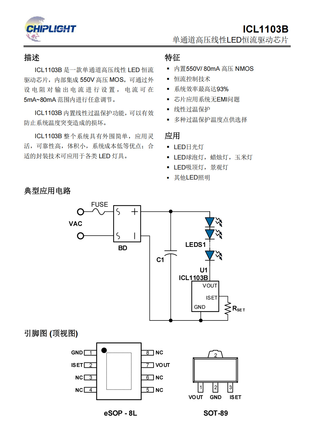 ICL1103B 是一款单通道高压线性 LED 恒流驱动芯片,内部集成 550V 高压 MOS。可通过外设电阻对输出电流进行设置,电流可在5mA~80mA 范围内进行任意调节。