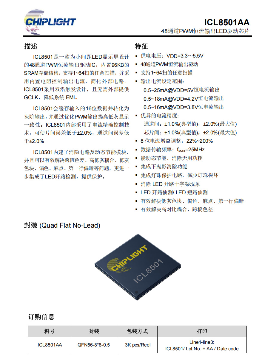 的48通道PWM恒流输出驱动IC,内置96KB的